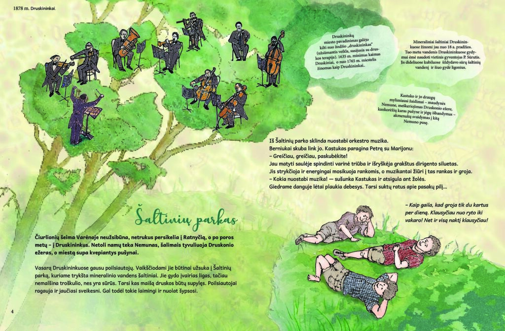Norėjome ir dar daugiau tokios informacijos pateikti. Pvz., paaiškinti, kas yra batuta, mazurka ar net papasakoti Druskininkų miesto legendą, bet, įsitraukus į darbą dailininkei, pasirodė, kad knyga neturės kuo kvėpuoti. Neliks vietos vizualiam pasakojimui, tad informacijos srautą smarkiai karpėme. Knygos pradžia buvo perrašoma ne vieną ir ne keturis kartus, kol po truputį atsirado „raktas“ tiek dailininkei, tiek ir mums.