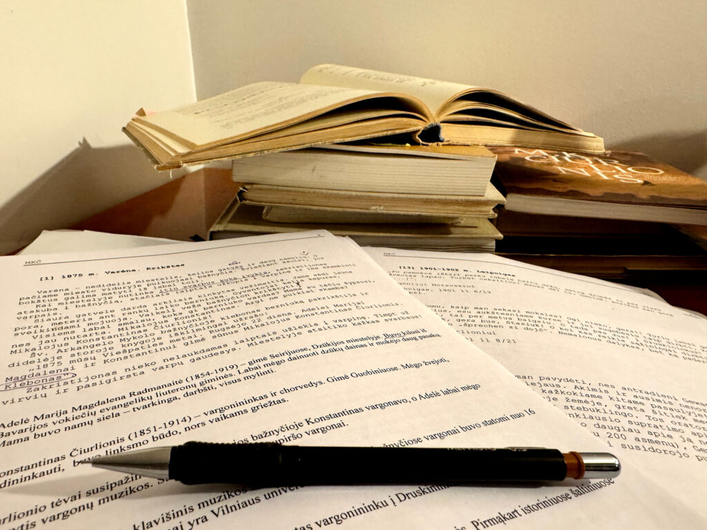 Daugiausia informacijos buvau atradusi J. Čiurlionytės „Atsiminimuose apie Čiurlionį“. Tačiau to toli gražu nepakako, kad viską nuosekliai ir įdomiai pateikčiau savo knygoje. Teko ir toliau keletą vasarų studijuoti laiškus, prisiminimus ir viską, kas tik atrodė gali būti įdomu mums ir skaitytojui.