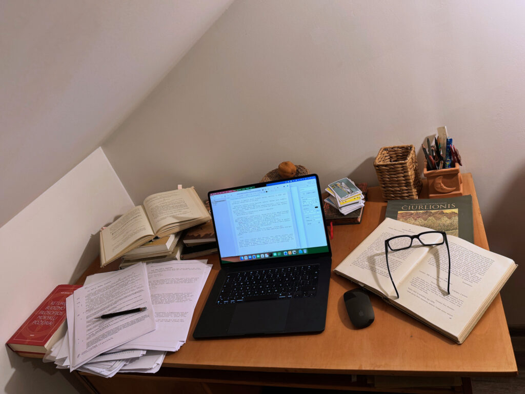 Kiekvienas iš mūsų pradžioje turėjome savo sritį, tačiau įpusėjus darbus viskas persipynė ir mes ėmėm blaškytis po visas sritis. Milda labai daug laiko praleido skaitydama ir nagrinėdama šaltinius apie Čiurlionį, pasižymėdama vertus dėmesio įvykius bei citatas. Bandžiau ir aš prisidėti, tačiau sugebėjau nuosekliai išstudijuoti tik vieną knygą. Visa kita skaičiau tik ten, kur man pirštu parodydavo.