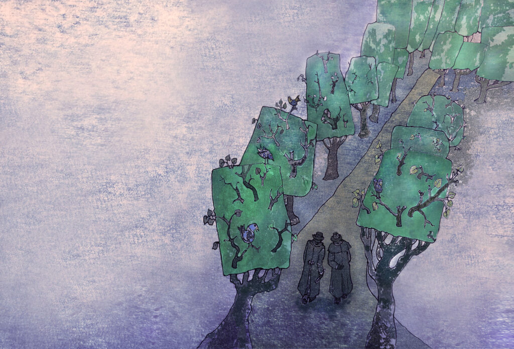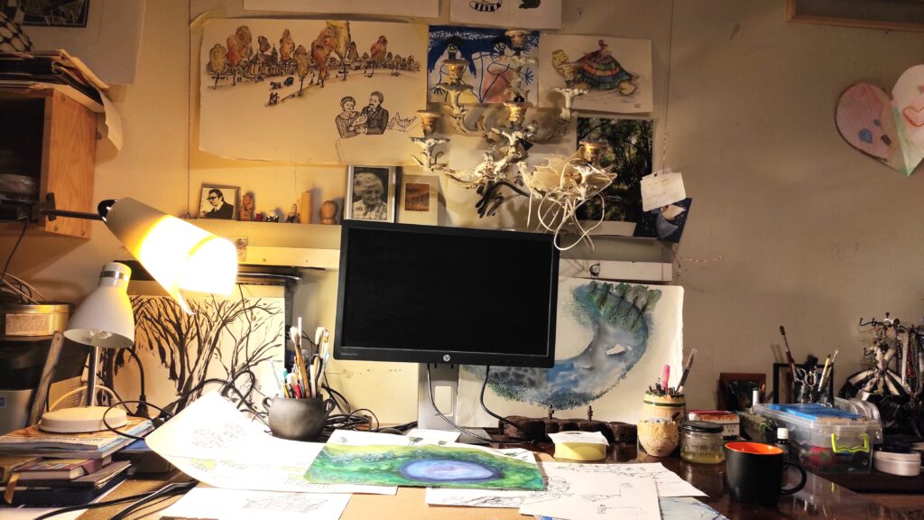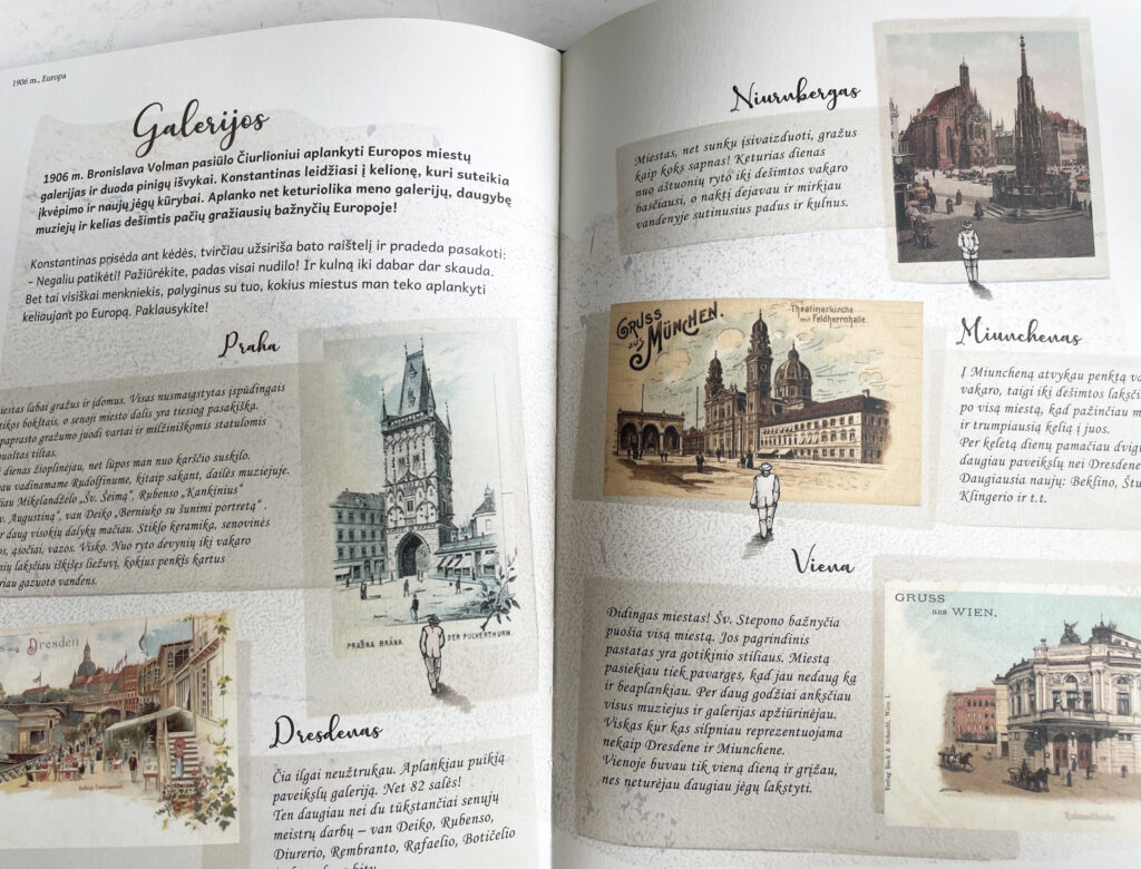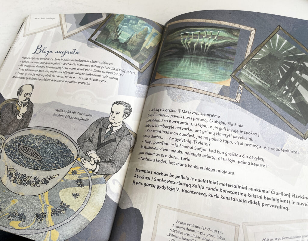 Išties bendradarbiavimas vyko nuolat – ir dėl teksto stiliaus, ir dėl piešinių, ir dėl detalių. Kartu praleidome kelias dienas Druskininkuose bandydami labiau įsijausti į Čiurlionio aplinką. Daug diskutavome, stengėmės būti atviri.
