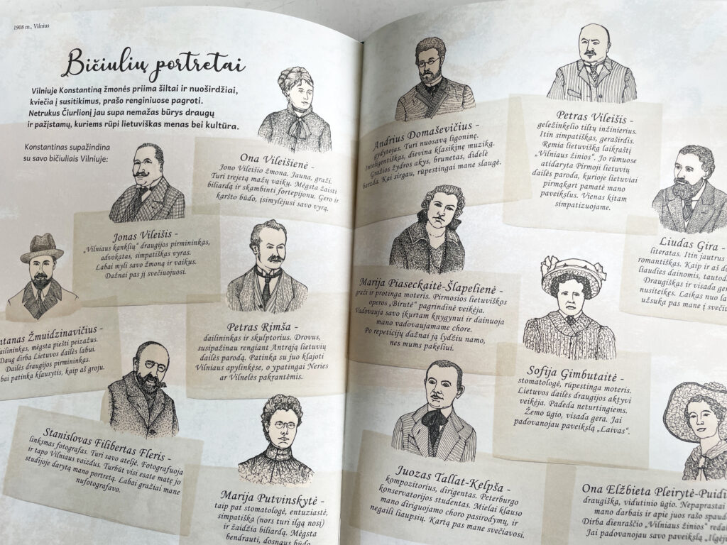 Visi knygos veikėjai vienaip ar kitaip susiję su Čiurlioniu. Vieniems skirta daugiau dėmesio, kiti paminėti tik probėgšmais. Knygos turinys sukasi apie Kastuko gyvenimo įvykius. Kokie veikėjai pasirodo tam tikro įvykio aplinkoje, tokie ir paminėti. Turėjome didesnį rūpestį: kaip atrinkti svarbiausius įvykius, nes jų buvome parengę daug daugiau, nei tilpo knygelėje. Teko skirti net porą knygos puslapių vien Čiurlionio bičiuliams Vilniuje aprašyti.