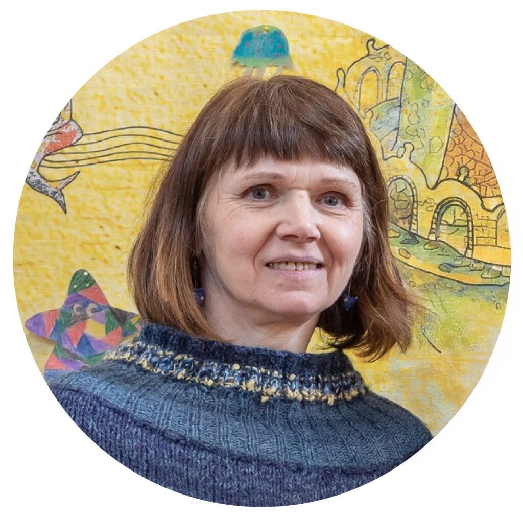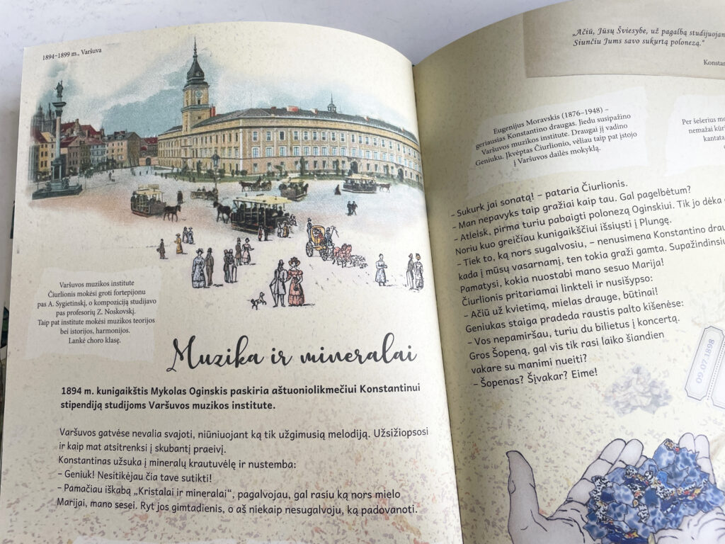 Galų gale sugalvojome, kad knyga bus šeimai. Tuomet atsirado galimybė pateikti ir informacinį bloką – debesėlius, kuriuose įrašyta enciklopedinė informacija. Ji reikalinga skaitant pagrindinį tekstą. Jei Kastukas eina susitikti su Geniuku, mes paaiškiname, kas tas personažas, ką jis reiškia Čiurlioniui.