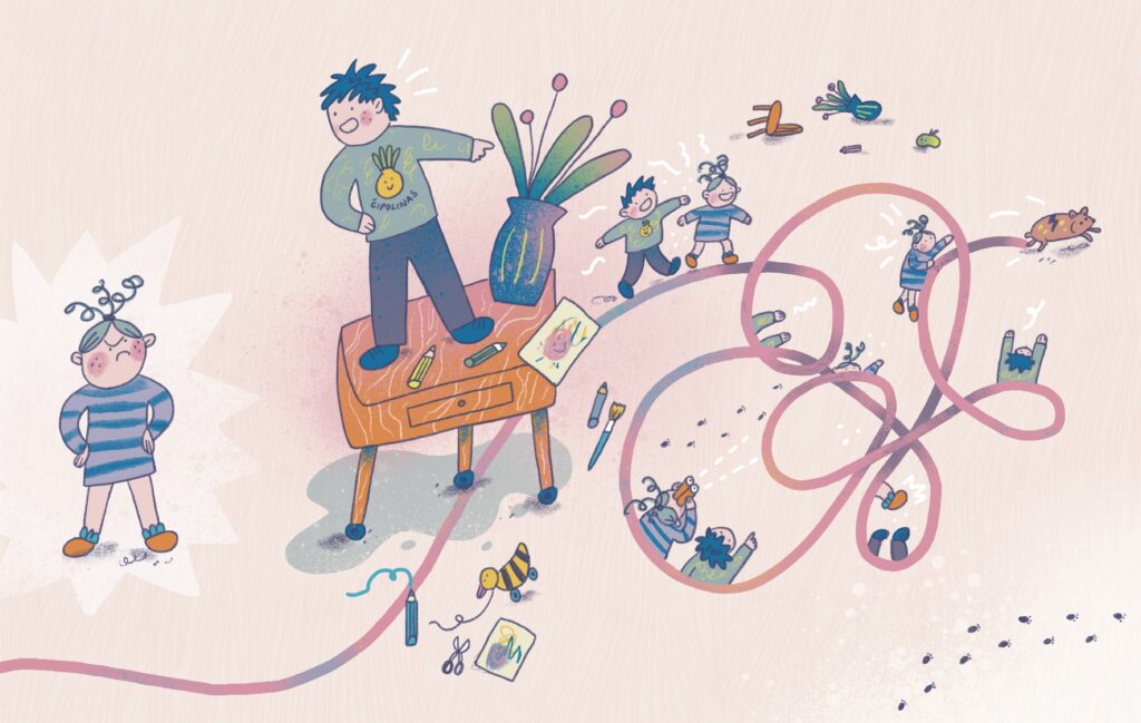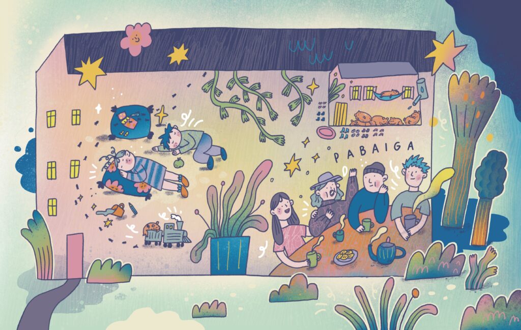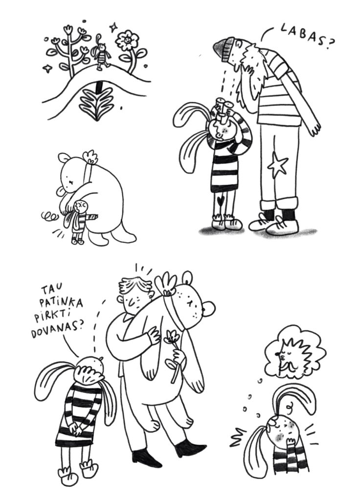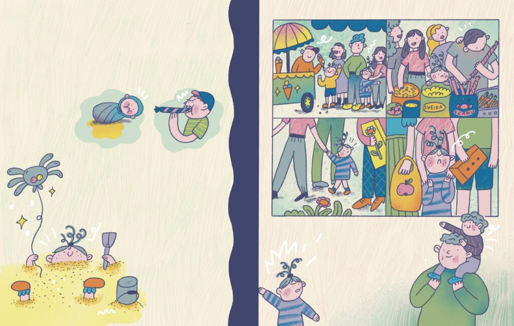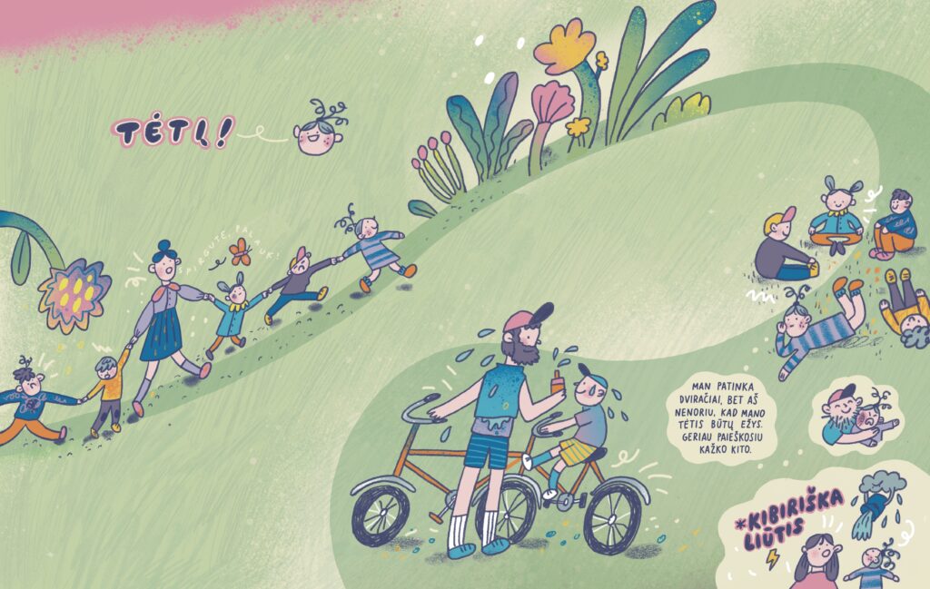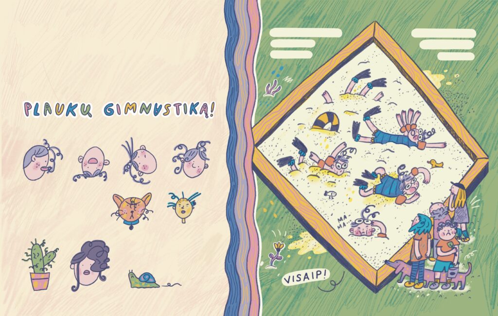 Labai norėjau tekstui skirti daugiau iliustracijų, daugiau atvartų, nes pirminė idėja buvo mažai teksto ir daug iliustracijų. Šarūnės tekstas vis tobulėjo ir pildėsi, o lapų knygoje liko tiek pat. Vienu metu net truputį tyliai pykau! Tad galvoje visą storyboard’ą perdėliojau, paaukojau kelis puikius atvartus, kuriuos įsivaizdavau ir labai norėjau nupiešti, bet galiniu rezultatu vis tiek esu labai patenkinta!