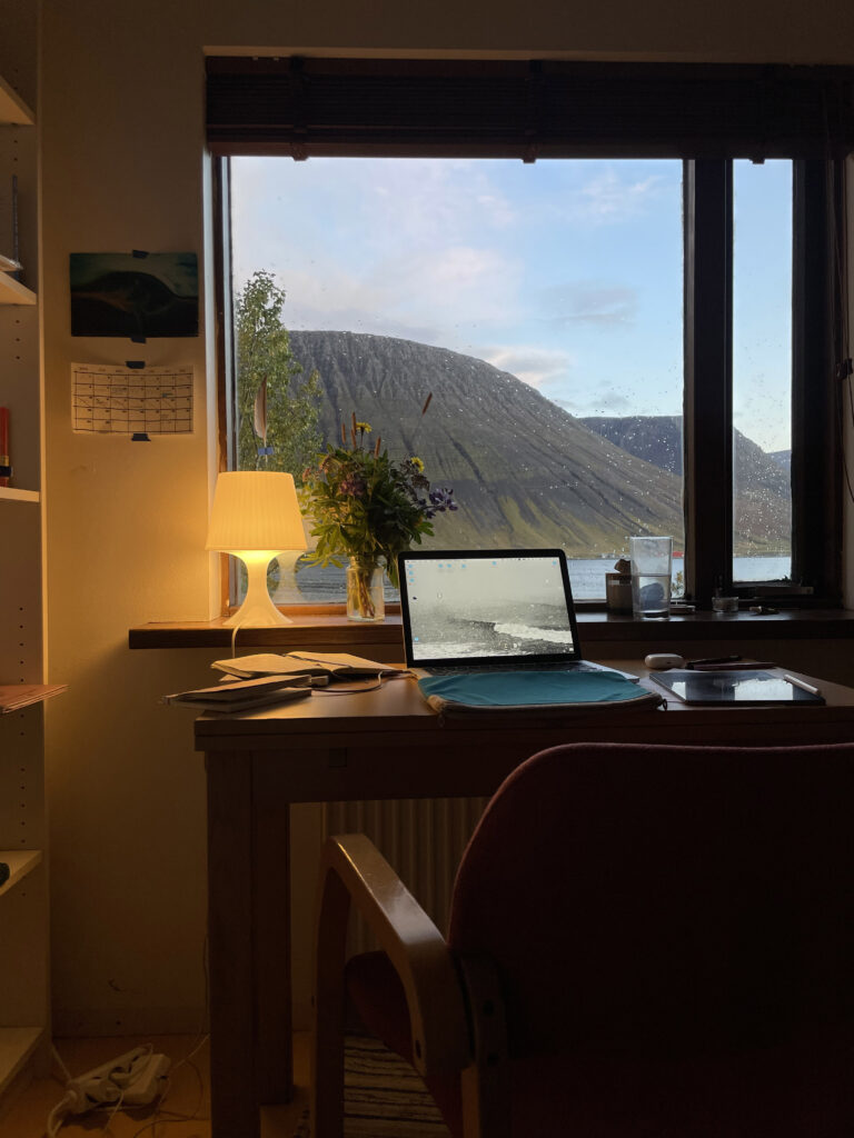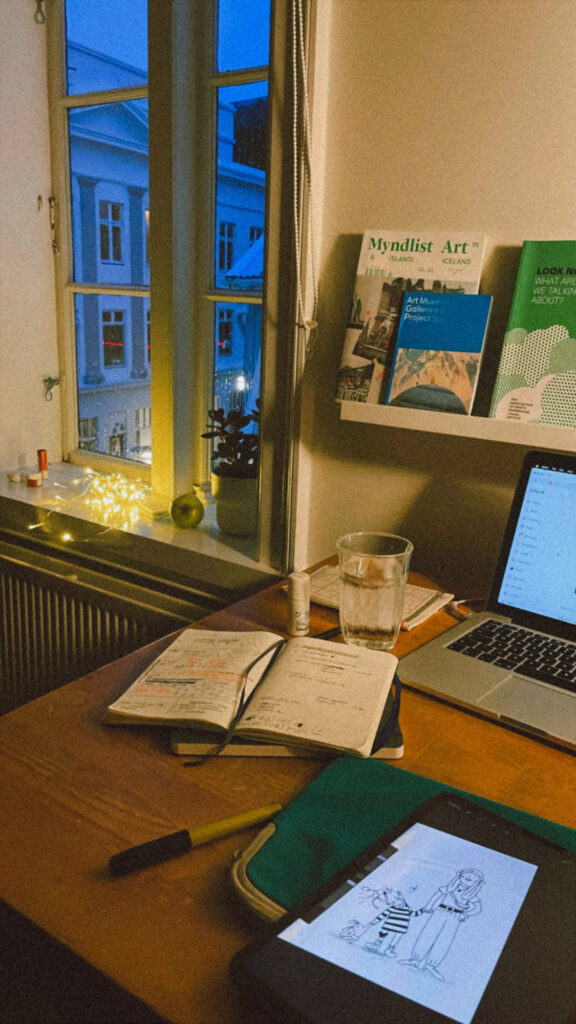 Ten aplinkybės buvo kiek sudėtingesnės, nes buvau menininkų rezidencijoje, o būnant Islandijoje man visuomet atsiveria vaizduotė ir gimsta įvairiausių idėjų ir projektų. Žinoma, viskas turi įvykti vienu metu, čia ir dabar. Tai tarp ilgų pasivaikščiojimų po kalnus, mėlyniavimų, elfų paieškų, asmeninių projektų ir bendravimų su kitais menininkais piešiau Spirgutę.