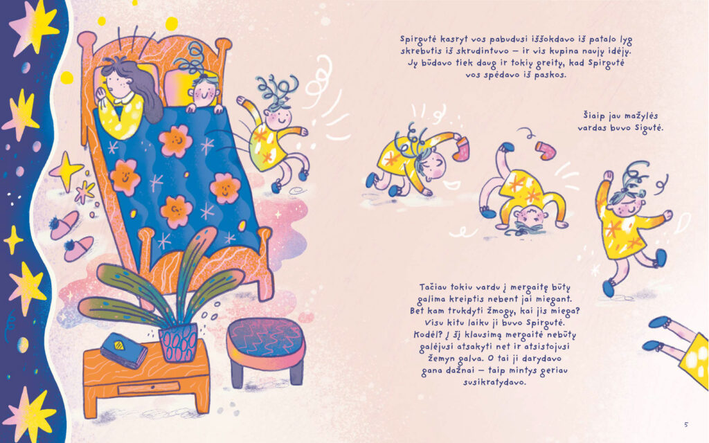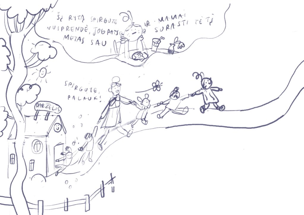 Kažkaip viskas dėliojosi natūraliai. Buvo vietų, kurias labai nekantravau iliustruoti, ir jos atsirado pačios pirmos. Tai Spirgutės plaukų mankšta bei plaukiojimas smėlio dėžėje. Pastarąjį tikrai ne kartą teko patirti, nes augant prie jūros dažnai nutikdavo taip, kad vanduo būdavo per šaltas maudytis, tad tekdavo „maudytis“ smėlyje. Taip pat iliustracijos su pabėgusiais žiurkėnais – aš turėjau mažąjį Kriugerį (vardą davė tėtis), storuliuką Sirijos žiurkėną, ir jis sugebėdavo kartkartėmis pabėgti iš narvelio. Rasdavome jį keisčiausiose vietose! Visuomet galvoje dėliojau istorijas, kaip jis sugalvodavo tokias trajektorijas po namus, kaip užsiropšdavo vienur ar kitur? Laikiau jį savu, maniau, kad jis kaip ir aš – mažas padarėlis, ištroškęs nuotykių. Šios knygos storyboardas buvo mano galvoje nuo pat pradžių, vos perskaičius tekstą. Tad beliko tiesiog atsisėsti ir piešti.