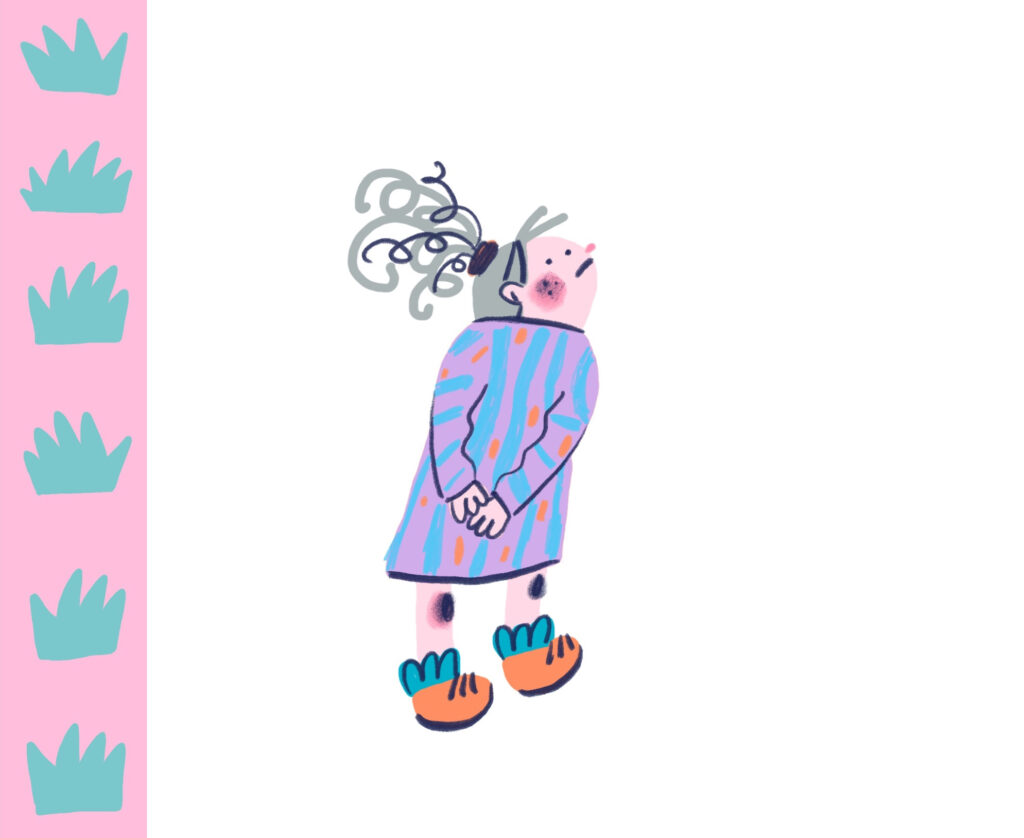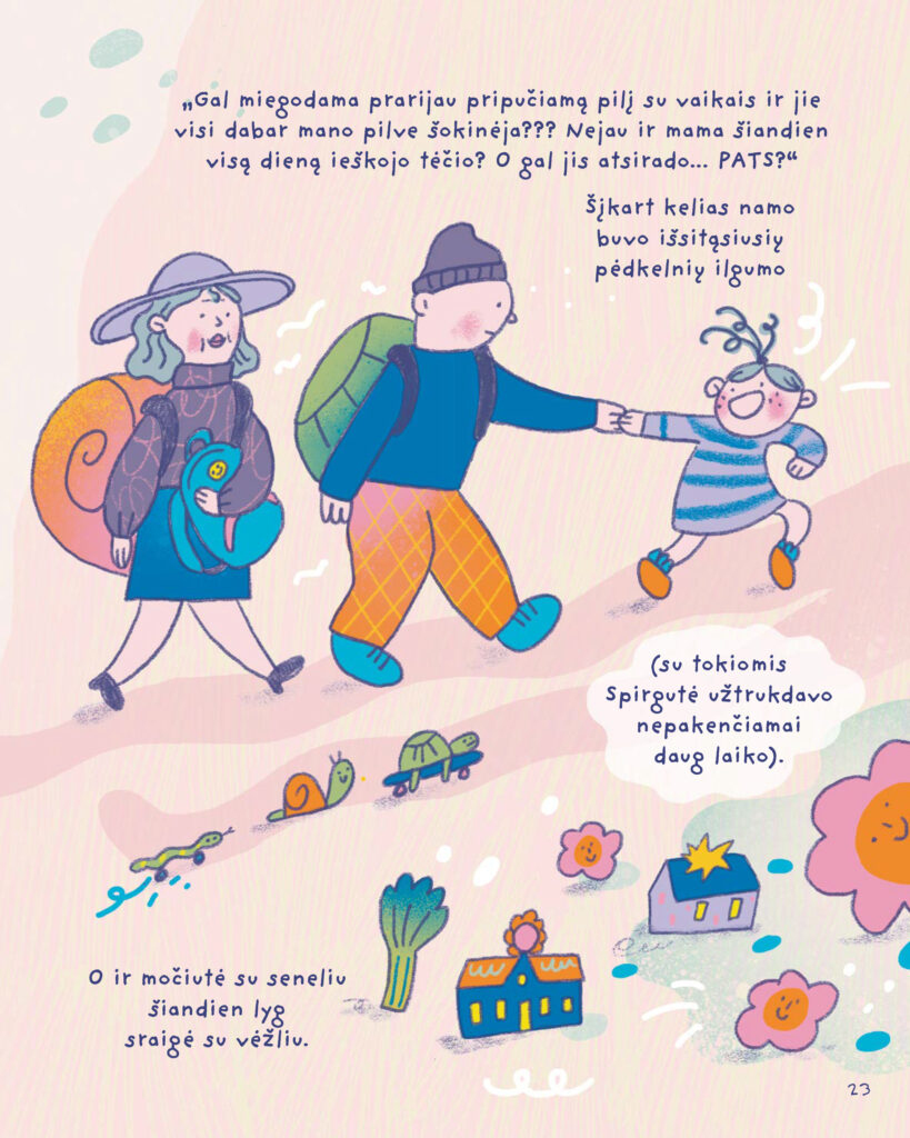 Beje, tekste buvau parašiusi, kad nekantraujančios iš darželio namo grįžti Spirgutės kelias buvo ilgas lyg naujos, dar niekada nenešiotos pėdkelnės. Man visada atrodydavo, kad sunkiausia ir daugiausia laiko užtrunka įkišti koją į siauras ir dar nepranešiotas pėdkelnes – kiši kiši koją, o tas nukaręs galas kaip kabo, taip kabo – regis, jam niekada neateis pabaiga. Ingai – priešingai – atrodė, kad kur kas ilgesnės yra gerokai pratampytos ir apsmukusios nuo nešiojimo pėdkelnės. Tad ėmiausi eksperimento klausinėti tėvelių su tokio amžiaus vaikais – kurias pėdkelnes užsimauti užtrunka ilgiau. Apklausa daugiausia vyko tame pačiame parke, kur sutikau tėtį su rožiniu naktipuodžiu. Nors rezultatai pasiskirstė panašiai, visgi nusprendžiau palikti pratampytų pėdkelnių metaforą.